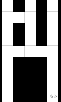 首先考虑是否可以枚举 H 的竖线(每个 H 有两个竖线,这里考虑左侧)。考场上糊了一个想法:记录每一条竖着的白线,以及每一个点往右可以到达的最近的点,图示情况可以后续推乘法原理加法原理的式子做到 。随后很快发现了不可行,因为即使我记录了每一个点向右最多可以到达哪些点,整体判断一个 H 的两条竖线是否一一对应还是 的。