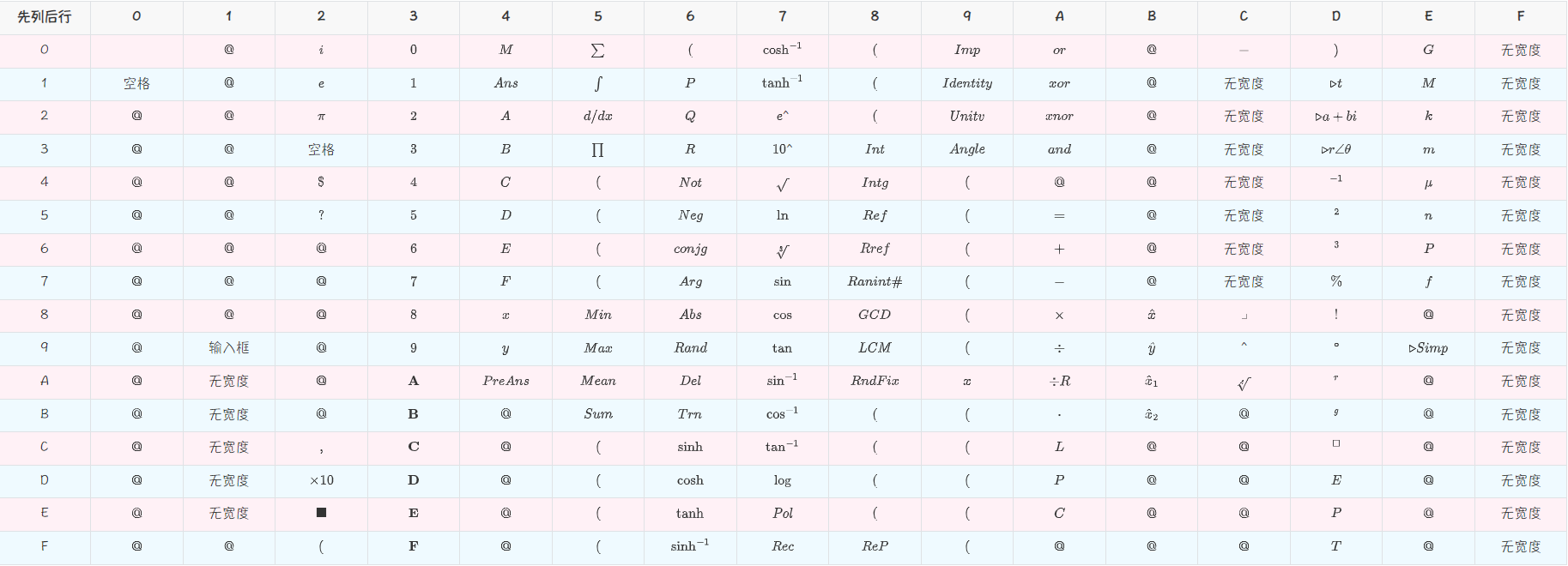 部分算符,尤其是一部分带有输入框的字符,会导致半卡死,对于不会导致半卡死也不会出现乱码的字符,有如下的段氏变换表(加粗的为工程符号,ENG 和 shift+ENG 只能在复数模式实现):